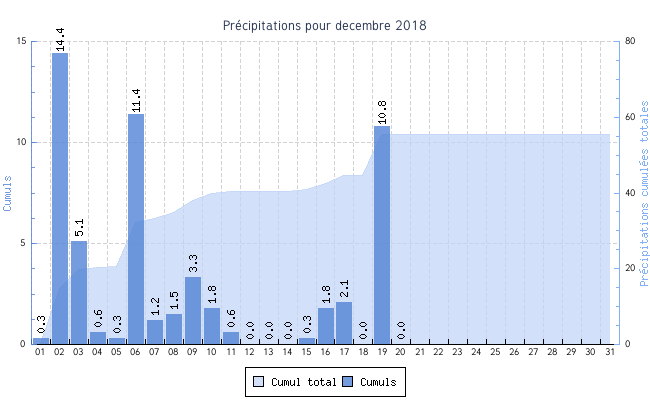 | Total | -4.4 °C | 15.0 °C | 6 °C | 10.1 km/h (70.9 km/h) | S |